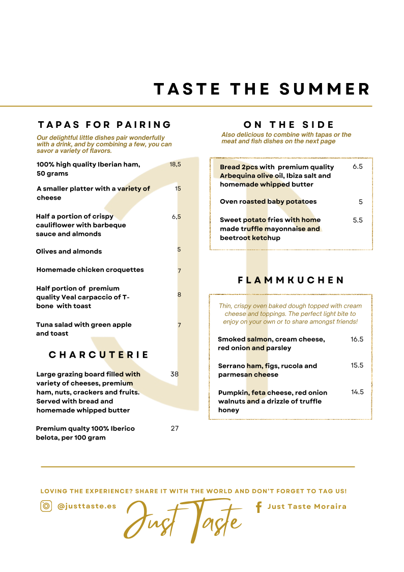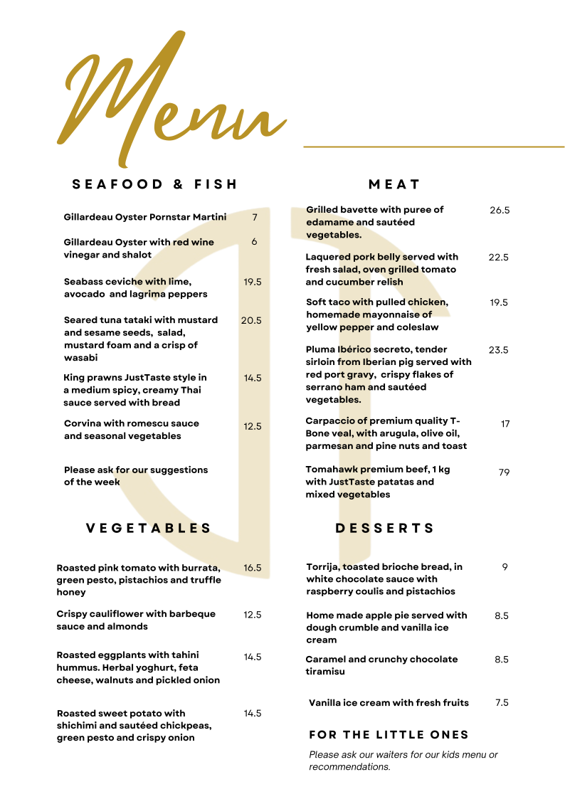 The menu offers a variety of food and drink options suited for casual dining and social gatherings. It includes a selection of starters, main courses, and desserts, with highlights such as cheesecake and seared tuna featured among the offerings.