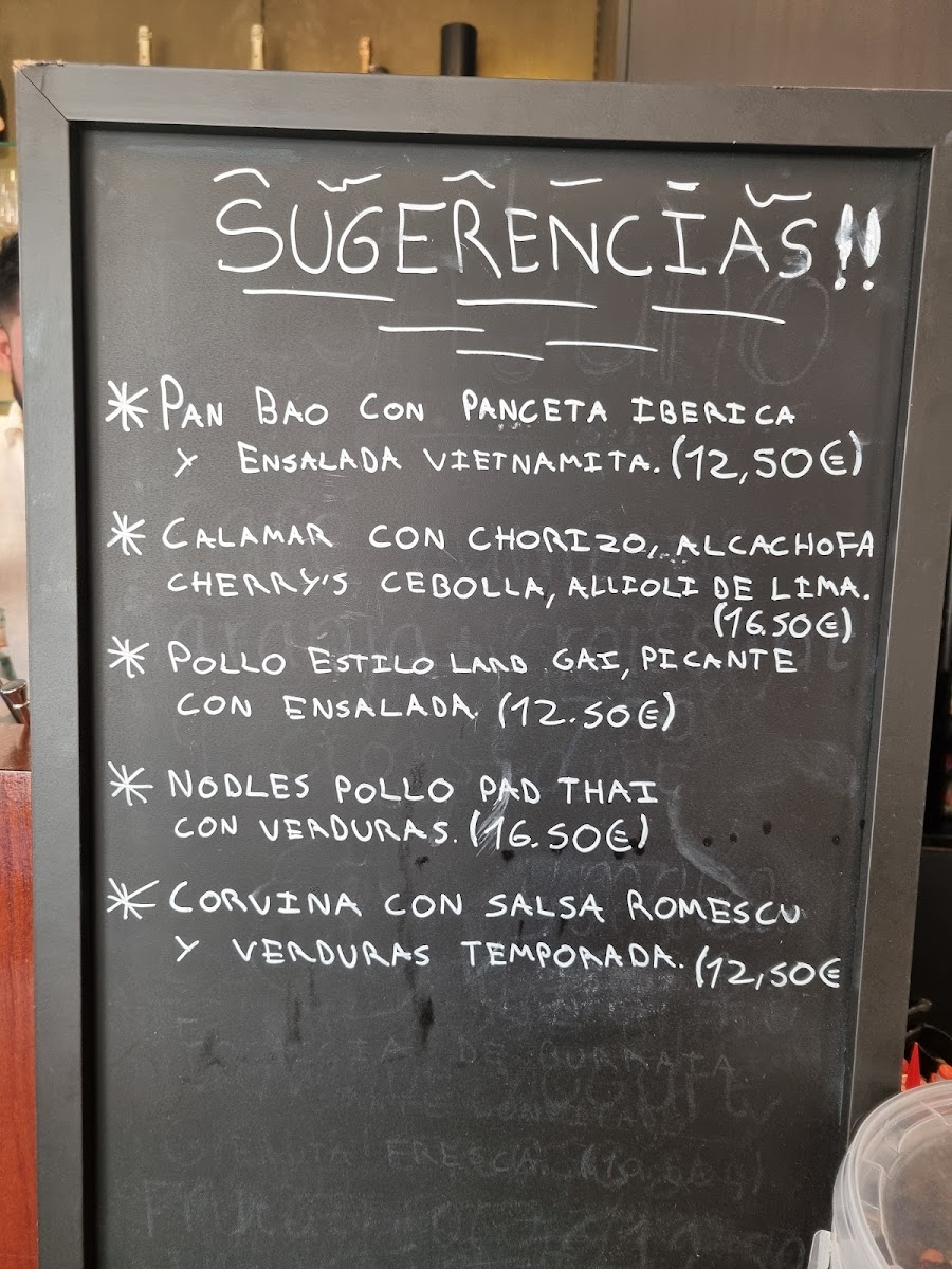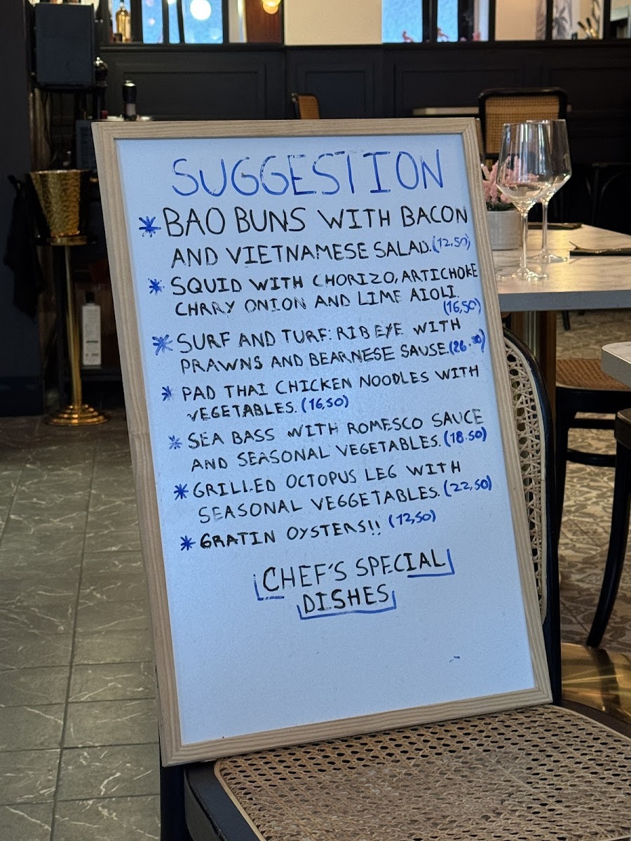 Food items typically consist of dishes suitable for sharing or individual servings, including options like croquettes, carpaccio, and calamares with chorizo. These items reflect a blend of flavors that cater to a diverse palate.